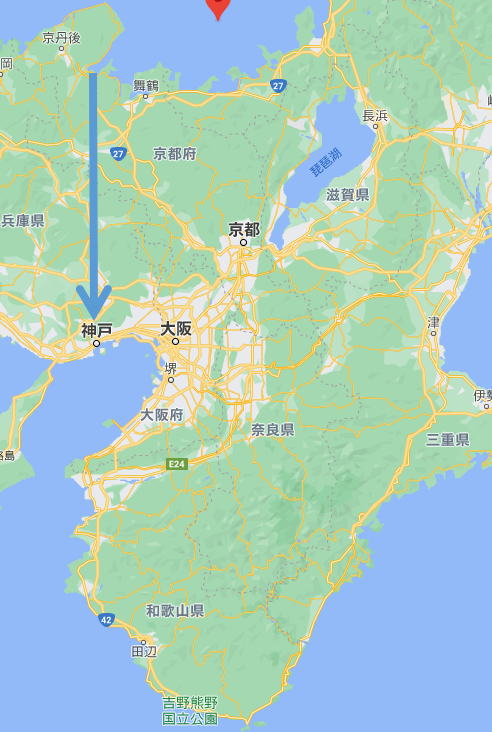 降り立つ場所は若狭湾の天橋立辺りを想定する。(大体この辺りだろうという決定)
