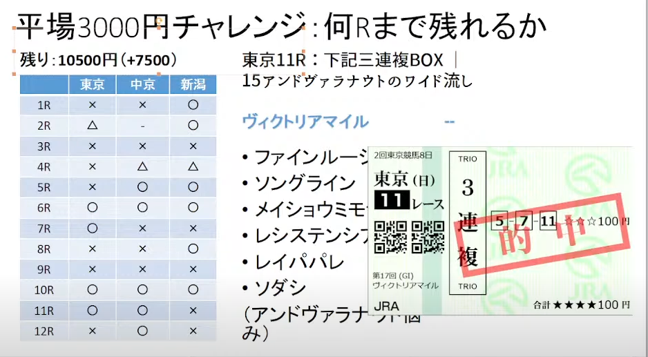 YoutubeLiveでやっている平場3000円チャレンジは久々のプラス決着でしたー!(土日合わせても)
