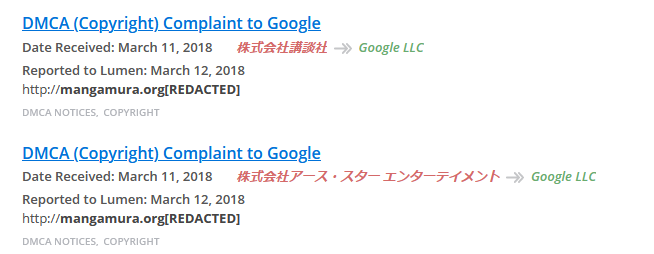 「日本の会社は、何もしなかったのか?」という意見が出てきそうだが、DMCAの申請をすると記録される「LUMEN」というサイトから検索すると、37ページにおよび履歴があり、日本の各出版社や各作者達がGoogleに対し、DMCAに基づく申請をしていることが分かる。(ちなみに2017年からの記録)
